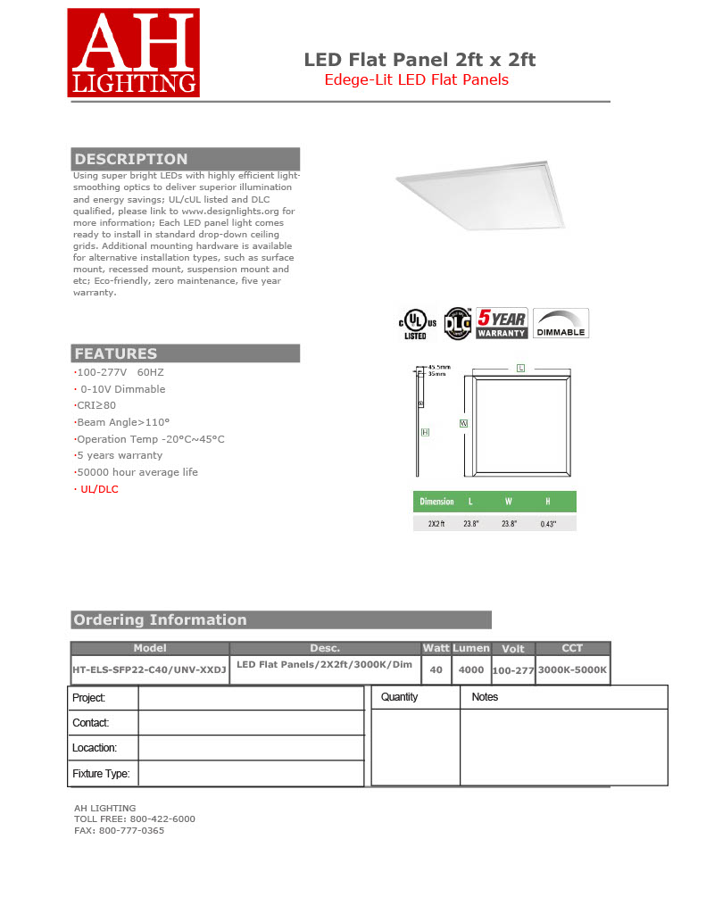 AH Lighting LED Backlit Panel Light Frame for 2ft x 2ft 3CCT Log in for pricing LED Backlit Panel Frame for 2ft x 2ft 3CCT ( 2 ft depth) FEATURES: Suitable for damp locations IC T…